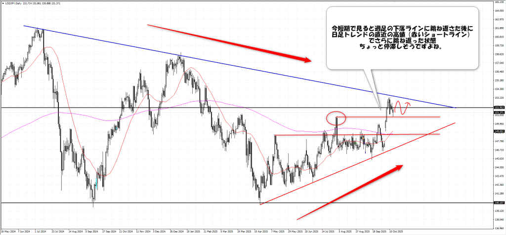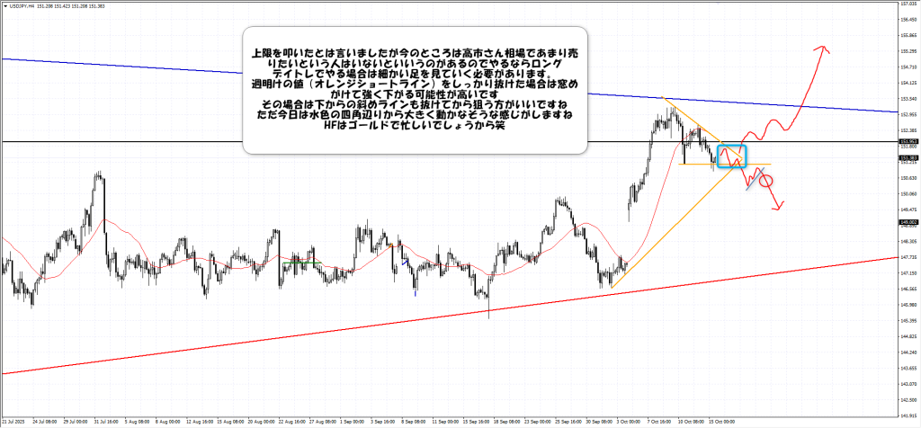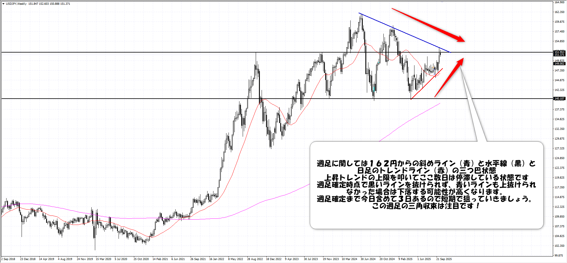 ドル円に関しては10月6日にできた大きい窓が開いたままなのでその辺を埋めにいくかどうか